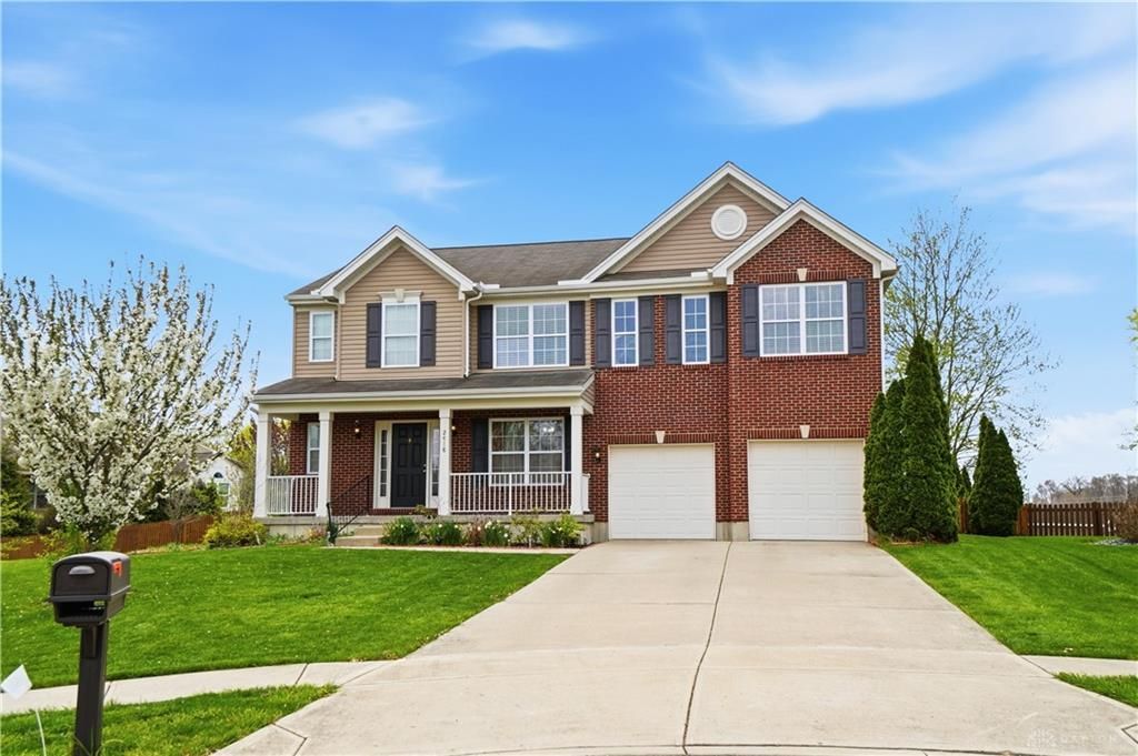 Discover unparalleled comfort and functionality in this gorgeous 4-bedroom brick two-story home, perfectly situated on a quiet cul-de-sac with a spacious lot that seamlessly backs onto a county park's beautiful green space. This residence offers an ideal fusion of everyday living and sophisticated entertaining. The bright and open floor plan flows effortlessly, showcasing a stunning kitchen adorned with hardwood floors and granite countertops, creating a seamless connection to the great room and an oversized breakfast area. Culinary enthusiasts will appreciate the integrated dishwasher, garbage disposal, microwave, range, and water softener system. Retreat to the second-floor primary suite, a serene sanctuary featuring cathedral ceilings, a dedicated sitting area, dual walk-in closets, and a spa-like bath with double vanities. The upper level also boasts a versatile loft space and three generously sized bedrooms, each complete with walk-in closets. Additional living space awaits in the finished basement, offering an open area alongside a dedicated office. This home prioritizes efficiency with a high-efficiency gas furnace. Outdoor living is enhanced by a covered front porch and beautifully maintained landscaping. The fully fenced backyard, complete with a patio, porch, satellite dish, and storage shed, provides an idyllic setting for relaxation or entertaining, with direct access to the peaceful natural surroundings. This property truly embodies space, style, and an unbeatable location in Fairborn.