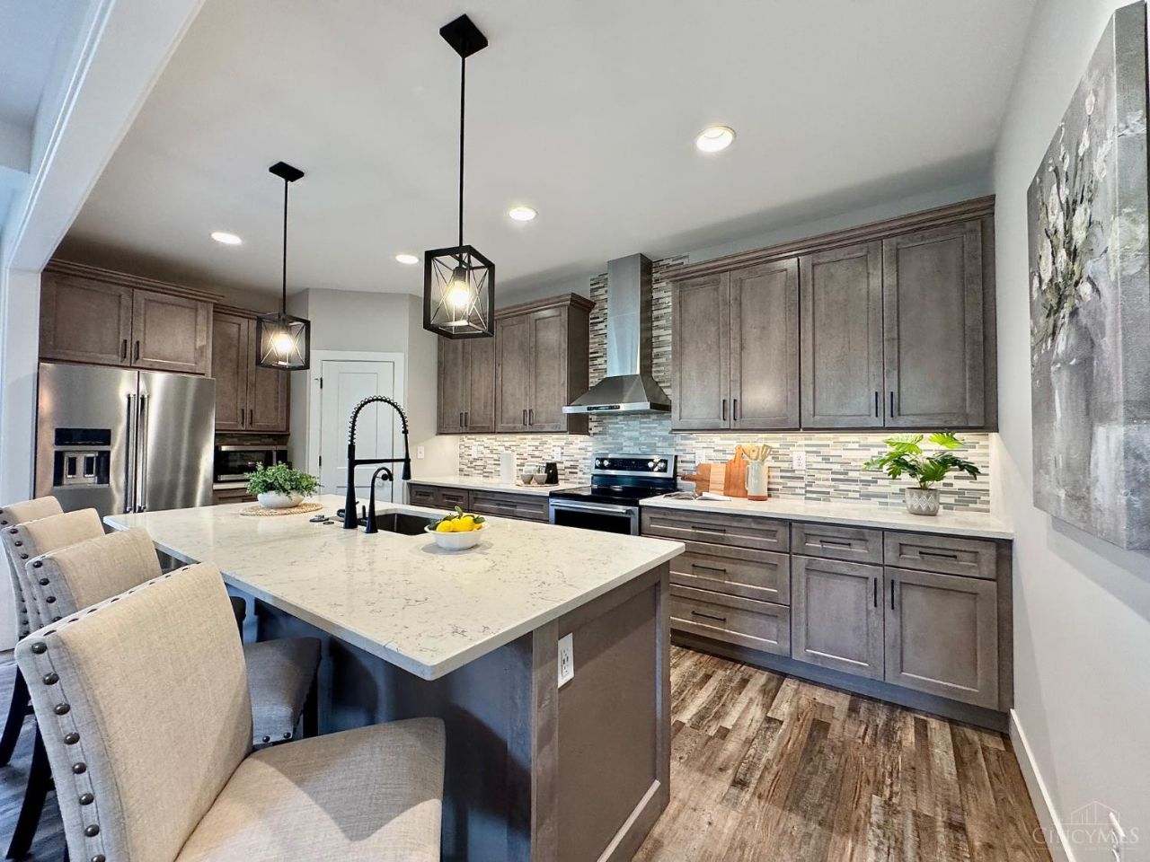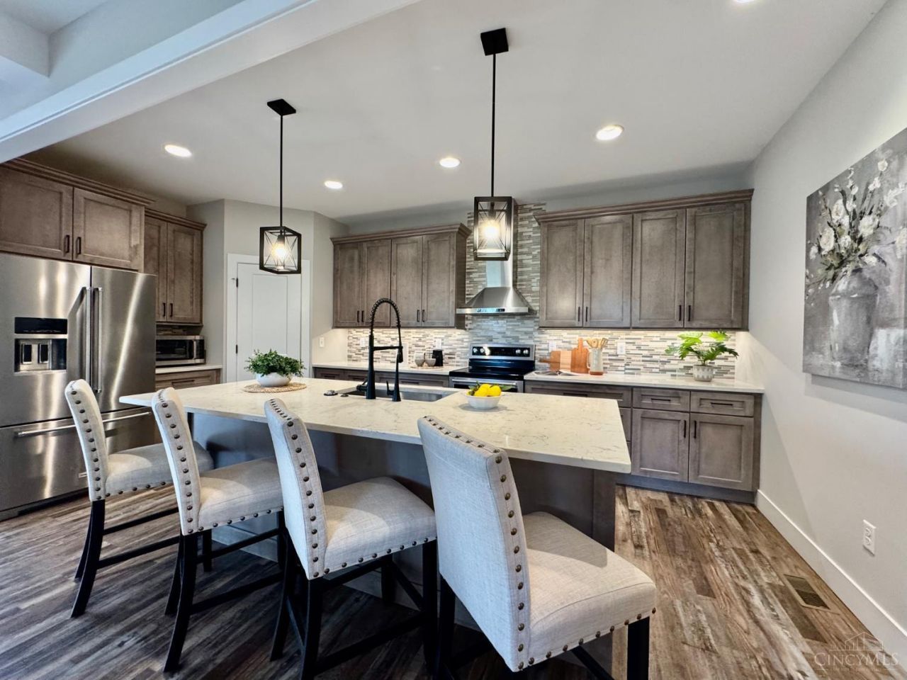 Custom-built in 2024 like-new Landen home offers luxury living with NO HOA! Featuring 5 bedrooms, 4.5 baths, 3,348 sq ft plus a finished basement, this home combines designer finishes with thoughtful construction. Highlights include 9' ceilings, custom beam detail, LVP flooring, quartz countertops, high-end cabinetry, and stainless KitchenAid appliances. Built for modern living, the home features 300-amp electrical service (two 150-amp panels) and a dual-zone HVAC system with two furnaces and two A/C units, including a fully independent second-floor system for superior year-round comfort. Upstairs you'll find 4 spacious bedrooms, 3 full baths, and an oversized laundry room. The primary suite features vaulted ceilings, dual walk-in closets, dressing area, and a spa-like bath. Finished basement with full bath, sauna-ready wiring, oversized garage, covered deck, and private fenced yard complete this exceptional home.