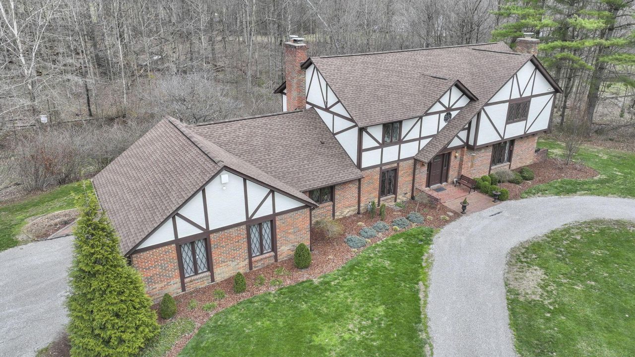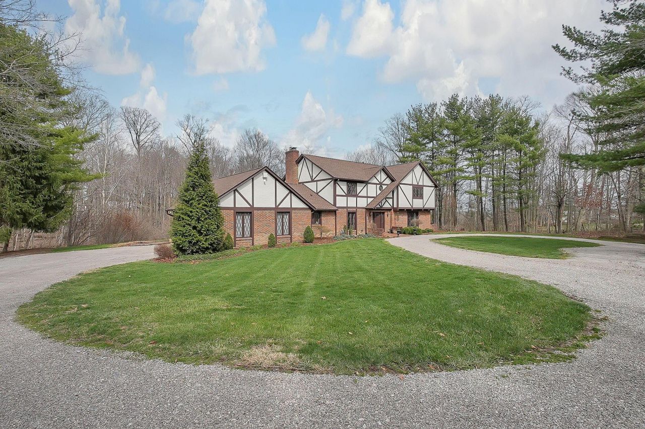 This hidden gem is tucked away in a private, picturesque setting. Situated on 2.53 acres with mature trees, a peaceful stream, and scenic views, this beautifully maintained, quality-built Tudor home offers a wonderful blend of timeless character, space, and a warm, inviting feel throughout. Brick walkways and a rear brick patio create inviting outdoor living areas. Step inside to a dramatic 2-story foyer and generously sized rooms throughout. The living room features a gas fireplace and flows seamlessly into the large dining room, creating a comfortable space for both everyday living and entertaining. A main-level den provides versatile living space. The remodeled eat-in kitchen showcases quartz countertops, newer appliances, an expansive island, and abundant cabinetry. It opens to a warm and cozy family room with a second gas fireplace--ideal for gathering and relaxing. Numerous windows & lovely hardwood floors add to the appeal of the home. The main-level laundry room offers excellent workspace. The hall bathroom is exceptional and has been recently remodeled. Upstairs, you'll find 4 spacious bedrooms and 2 full bathrooms. The primary bedroom features a deep walk-in closet, hardwood floors, and an en-suite renovated bathroom. Enjoy the charming 3-season room with exposed brick, overlooking the peaceful rear yard--an ideal spot to unwind and take in the natural surroundings. Additional highlights include a newer roof (2024), freshly painted exterior (2024), radon mitigation system, an oversized 2-car garage, circular driveway, and a large shed for added convenience. Nearby Routes 16/161/37 & 70 for easy access to Columbus, Newark, Granville and Zanesville. There is so much to love about this special property!