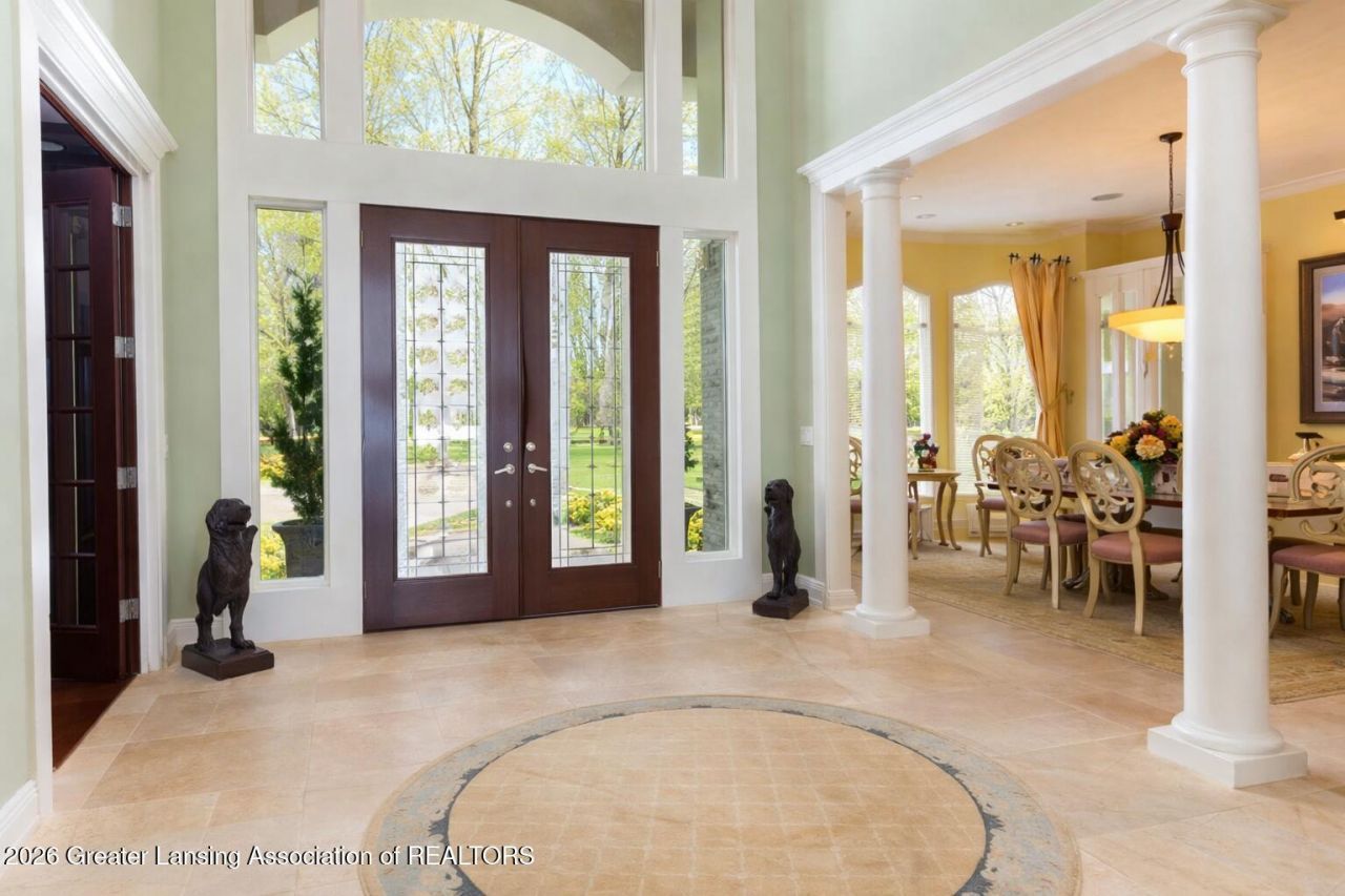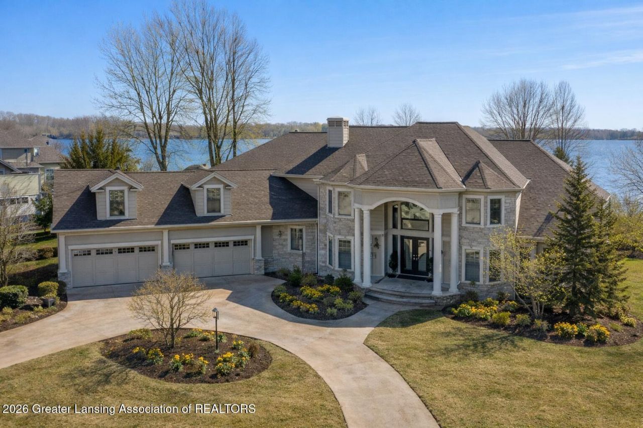 Lake Lansing on the water! Rare offering for this 9,000+/- sq. ft. 6-bedroom 7.5 bath two-story nestled on over 2 lots directly on the water! Over the top quality and finish work throughout with 10-foot ceiling heights, 8-foot interior doors, luxurious hydraulic heating on the main floor, 4 fireplace fronts, Grabil & Decora cabinetry, amazing manufactured all stone/concrete exterior, 2x6 construction, plus so much more! Spectacular and dramatic foyer entry offering a sweeping wrought iron circle staircase with enlarged tumbled marble flooring with overlooks. Magnificent great room including built-ins plus floor to ceiling windows; breathing the outside in. The main floor library includes stunning panel molding, built-ins, and gleaming hardwood flooring accented with a bay window. The formal dining room is enchanting with custom China door display cabinets and a pretty bay of windows. The Grabil kitchen is simply breathtaking, including a sub-zero refrigerator, Dura ovens, and 6 burner gas range. A beautiful fireplace, coffee bar and an amazing walk-in pantry. A gleaming granite center island, eating bar with seating, plus special custom cabinet inserts including a beverage refrigerator and yummy backsplash! The eating area is simply amazing with direct water access through the oversized doors to the outside covered deck & patio with direct access to the lake. Special landscaping and gardens. The laundry room and drop zone also is a planning center with a walk-in closet. 4+car heated garage with built-ins, sink, floor drains, plus a staircase to the basement! The full glitzy bath has a changing room, two special vanities, plus a separate stool and shower room for easy access from the water! Enjoy the spa room with a hot tub, exercise and game space, plus an out of a magazine pub game room, stacked stone fireplace, full wet bar, media space and more! The 4-season sunroom with inlaid floors and porch paneled ceiling, soaks in the eastern and southern sunlight and a wonderful theater room; screen & projector included. The first-floor primary suite will take your breath away offering tray ceilings, sitting area in the bay, two amazing walk-in closets with built-ins, plus a spa bath with a walk-in shower, air jet tub and miles of vanity space. 5 oversized bedrooms on the 2nd floor, each with a walk-in closet and full bath. Two have access to a balcony overlooking Lake Lansing, one has special tray ceilings and a bunk room with a fabulous extra-large bath and closet space. If this is not enough the third-floor family room with special windows nestled in a dormer with full views of the Lake, may do it. The basement has three daylight windows plus large storage and is under the entire home. Circle driveway! Great seawall with sandy bottom. Built-in speakers, amplifiers and receivers. Loads of upgrades and extras throughout! Priced way below duplication cost. This cottage and home in one are a living dream and waiting for new owners!