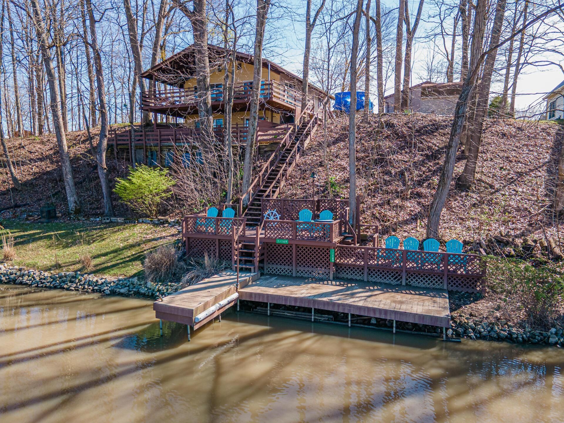 This beautiful, nearly 3,000 square foot cottage-style lakefront home features a picturesque view of the lake from two large, entertainer's decks located on both the upper and lower levels. An open floor plan with an island kitchen, dinette, and living room features a wood beam cathedral ceiling and, as the centerpiece, a newly installed, stone-wrapped woodburning fireplace. Luxury LVT vinyl flooring is located throughout the house. Also on the first floor are 2 bedrooms and a full bath. The newly renovated, walkout lower level features a large family/recreation room with full wet bar, as well as a full kitchen, two dining areas, and an additional bedroom and full bath. Steps from the lower-level lead down to the private boat dock. Newer items include all kitchen appliances, central air conditioning, roof, gas furnace, lower-level deck, and retaining wall. A 2-car detached garage, storage shed, beautiful landscaping and a concrete drive round out this must-see property! Come enjoy living the lake life at Candlewood Lake!